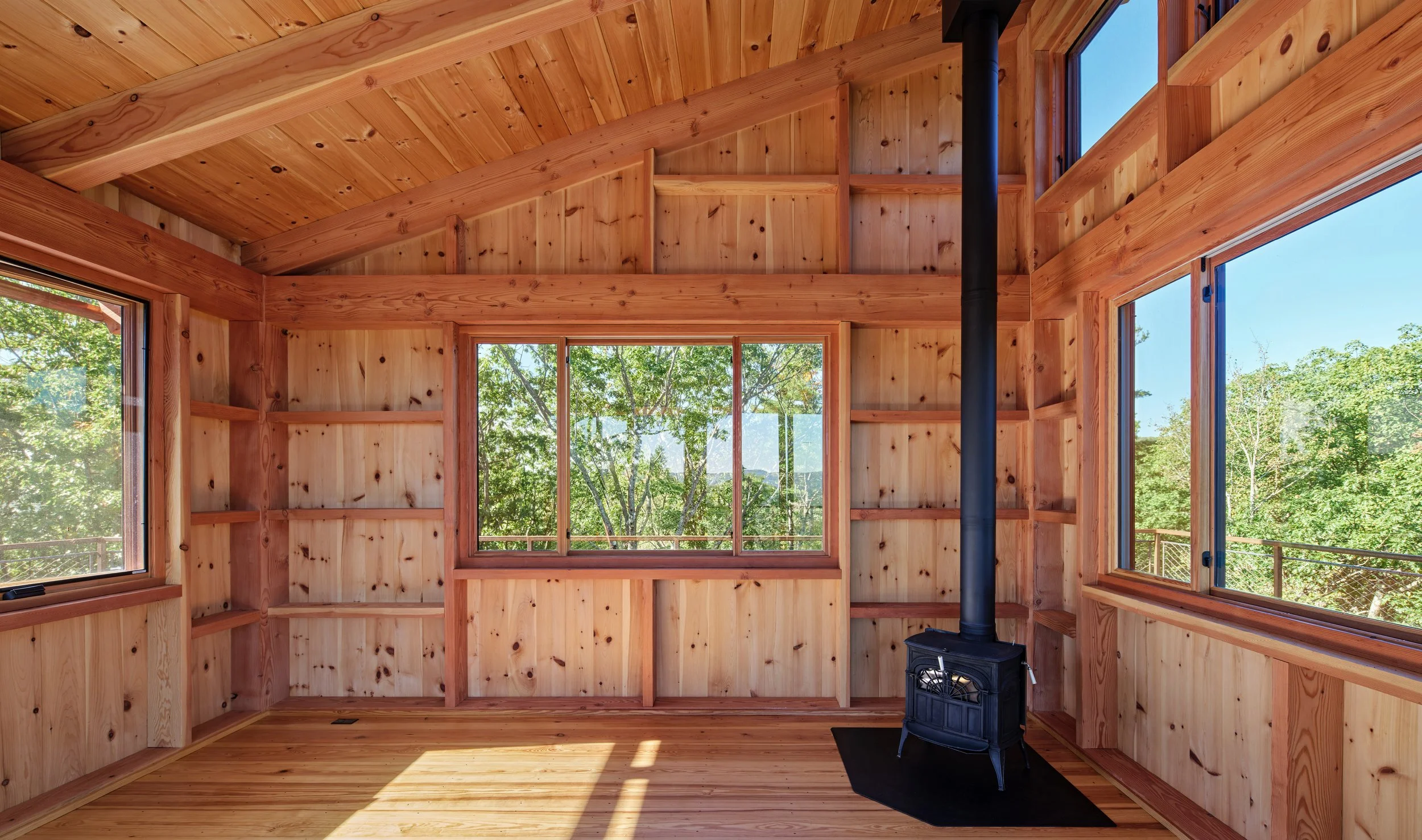 The hut is not connected to any electrical grid. It uses solar power for elementary electricity. The space is heated by a wood burning stove, and cooled by natural ventilation enhanced by operable clerestory windows that produce a natural stack effect in order to circulate air. The space is intended for events, or solitary contemplation. A secret folly, hidden in the dense, northern landscape.